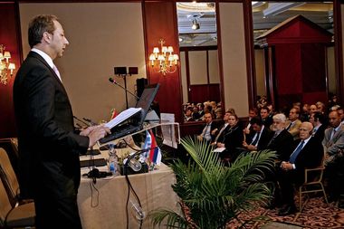 Српско-грчком бизнис форуму присуствовали су председник Владе Србије Мирко Цветковић, председник Грчке Карлос Папуљас и бројни представници грчких и српских компанија.