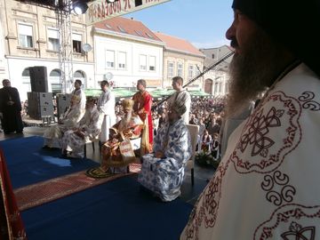 У саопштењу се наводи да је Свету архијерејску литургију на градском тргу служио патријарх Српске православне цркве Иринеј са епископима сремским Василијем, бачким Иринејом и осечко-пољским и барањским Лукијаном.