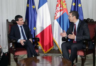 Након свечаног дочека започео је одвојени састанак премијера Вучића и Валса, на чијем је почетку, у делу отвореном за медије, председник Владе Србије поручио да пријатељски односи Србије и Француске никада нису довођени у питање.