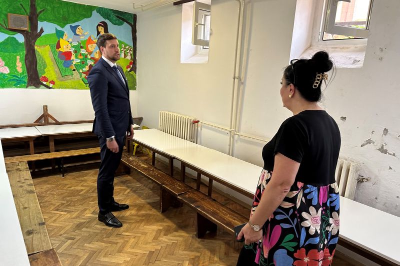 Ђерлек је данас обишао и вртић „Бисери“ у Прокупљу, који је тешко оштећен у недавним временским непогодама и разговарао са директорком ове установе Весном Јовановић.