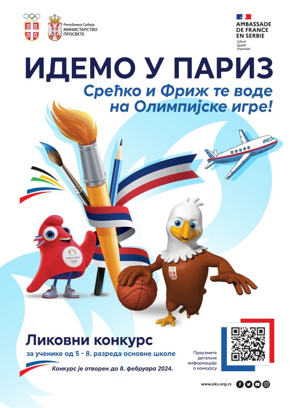Министарство просвете, Амбасада Републике Француске у Србији и Олимпијски комитет Србије приредиће ликовни конкурс за ученике од петог до осмог разреда основних школа „Идемо у Париз, Срећко и Фриж те воде на Олимпијске игре!”.