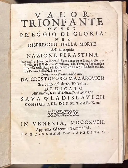 Ова књига, објављена у Венецији 1718. године на италијанском језику, под оригиналним називом Cristoforo Mazarovich: Valor trionfante overo preggio di gloria nel dispreggio della morte dell intreoida nazione perastina...), посвећена је грофу Сави Владисављевићу, што јој даје додатну важност за нашу културу.