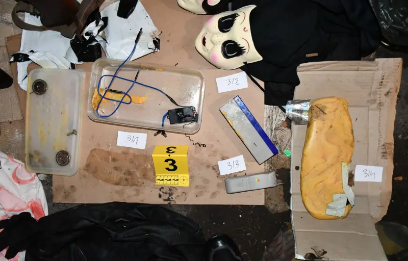 Пронађена су и два панцирна прслука са ознакама „полицијаˮ, средства за везивање – лисице, опасачи и футрола за ватрено оружје, као и импровизована службена легитимација МУП-а, ручне радио-станице за комуникацију и више маски за сакривање лица.