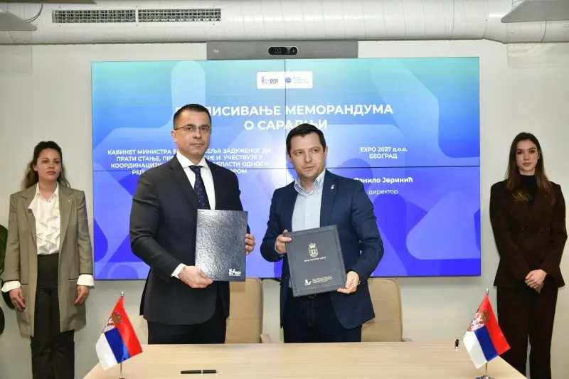 Министар без портфеља у Влади Републике Србије задужен да прати стање, предлаже мере и учествује у координацији активности у области односа са дијаспором Ђорђе Милићевић потписао је данас Меморандум о сарадњи између Кабинета на чијем је челу и предузећа „EКСПO 2027“ д.о.о. Београд.