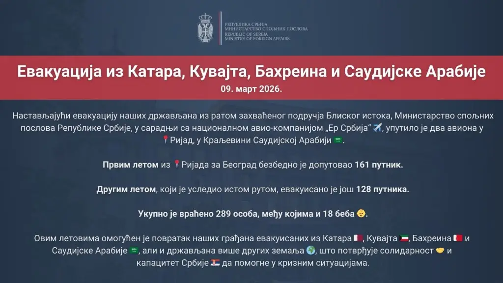 Министарство спољних послова Владе Републике Србије саопштило је да су два авиона националне авио-компаније „Ер Србија“ синоћ из Ријада слетела на Аеродром „Никола Тесла“ у Београду са укупно 289 путника, међу којима је било 18 беба.