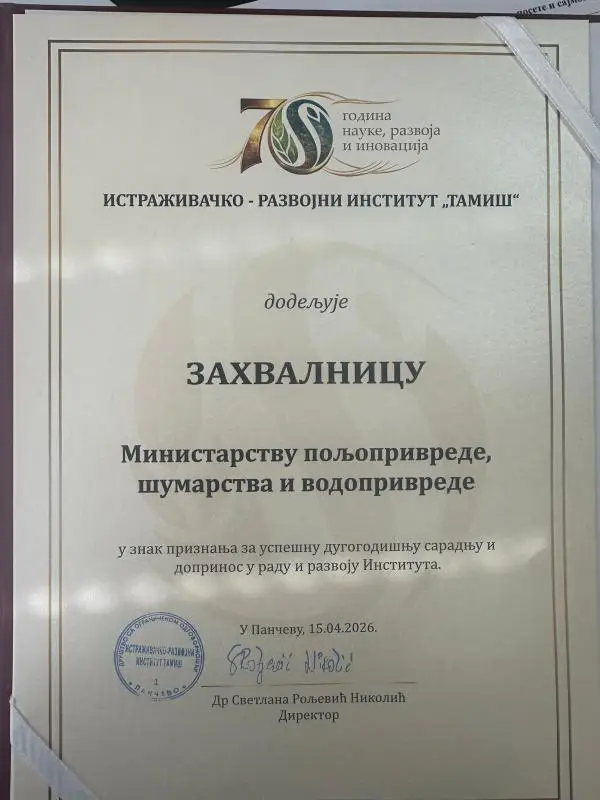 Државна секретарка Министарства пољопривреде, шумарства и водопривреде Владе Републике Србије Стана Божовић оценила је данас да 70 година постојања Института „Тамиш“ у Панчеву представља континуитет знања, резултата и посвећеног рада генерација стручњака који су утицали на унапређење пољопривредне производње у Србији.