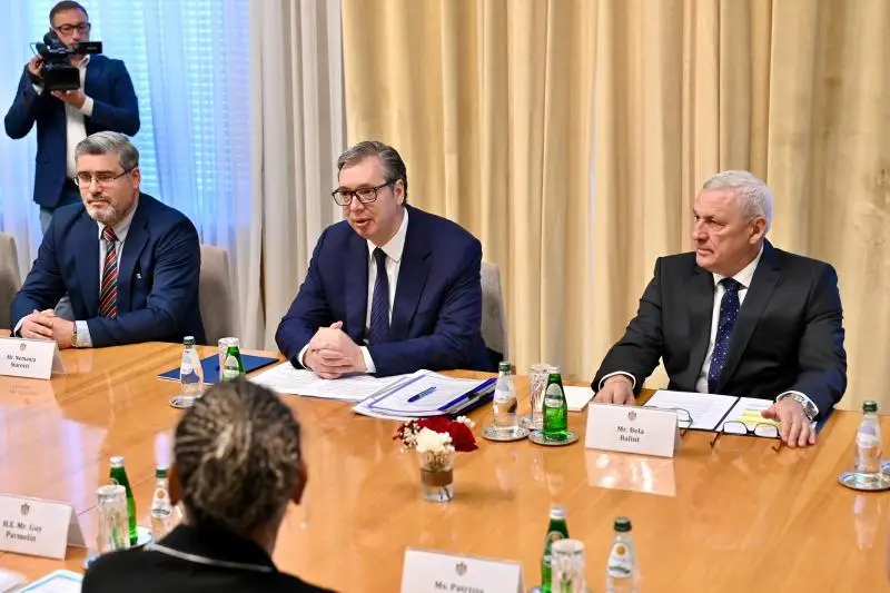 Вучић и Пармелан су претходно имали тет-а-тет састанак, а председнику Швајцарске је приређен свечани дочек испред Палате Србија, уз интонирање химни двеју земаља и почасни строј Гарде Војске Србије.
