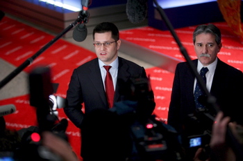 Vuk Jeremic, left, and Slobodan Samardzic address the media