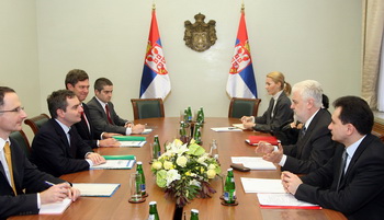 The agreement was signed at the Serbian government building, following the meeting between Serbian Prime Minister Mirko Cvetkovic, Minister Djelic, Minister Dragutinovic and EIB President Philip Maystadt.